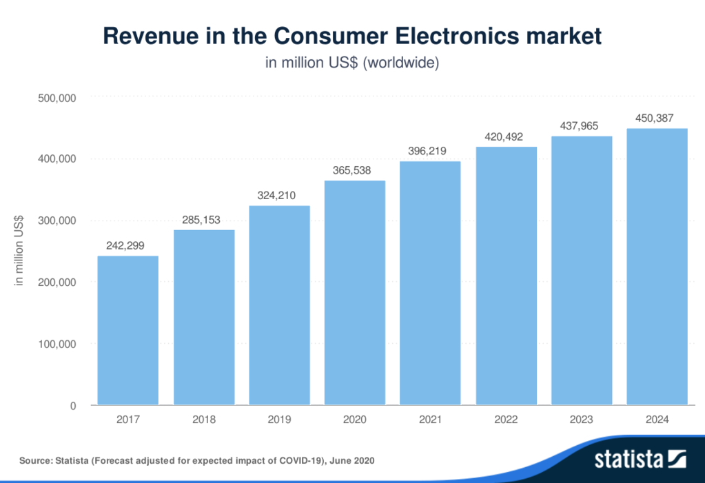 In 2020, the worldwide consumer electronics market is expected to top $365 billion USD and is projected to grow to more than $450 billion USD by 2024: