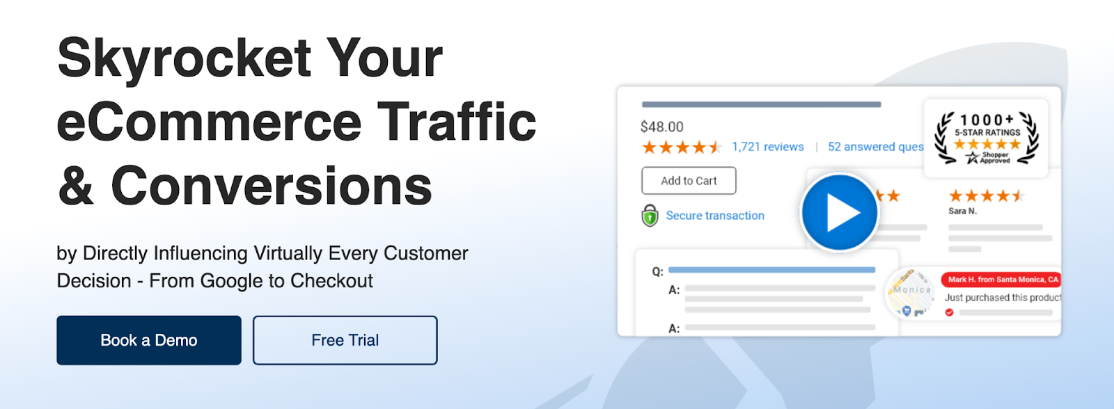 ShopperApproved has tools to ease Q&As, video reviews, and surveys. They also have two review-related features: ‘Seller Ratings’ and ‘Product Reviews’.