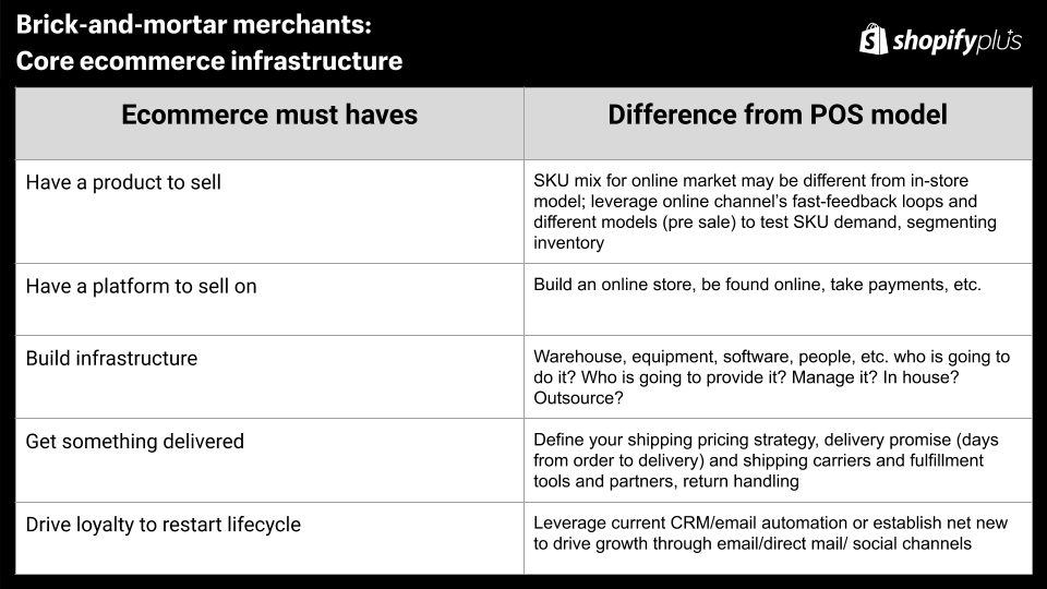 The in-store experience has, and will continue to, change to include contact-free amenities. Retailers must equip their businesses to capitalize on the shift to ecommerce. Dubois offers a slide illustrating what retailers need to succeed online: