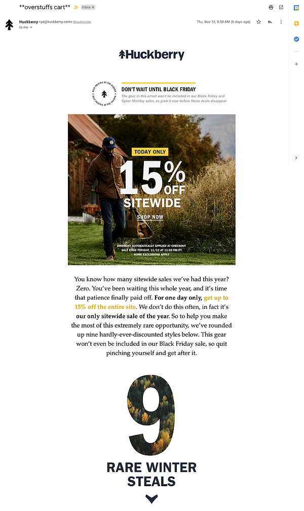 But I love the way Huckberry positions theirs. “You know how many sitewide sales we’ve had this year? Zero. You’ve been waiting this whole year, and it’s time that patience finally paid off. For one day only, get up to 15% off the entire site. We don’t do this often, in fact it’s our only sitewide sale of the year.”