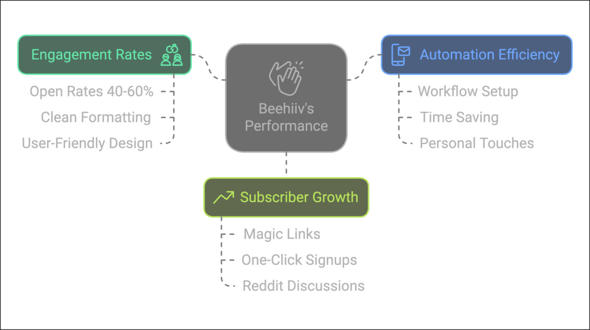 Beehiiv’s performance is often a focal point in reviews, particularly regarding user engagement and email deliverability. Creators have highlighted strong results in key areas like open rates and click-through rates, often surpassing industry averages. Here are some takeaways from user feedback:
