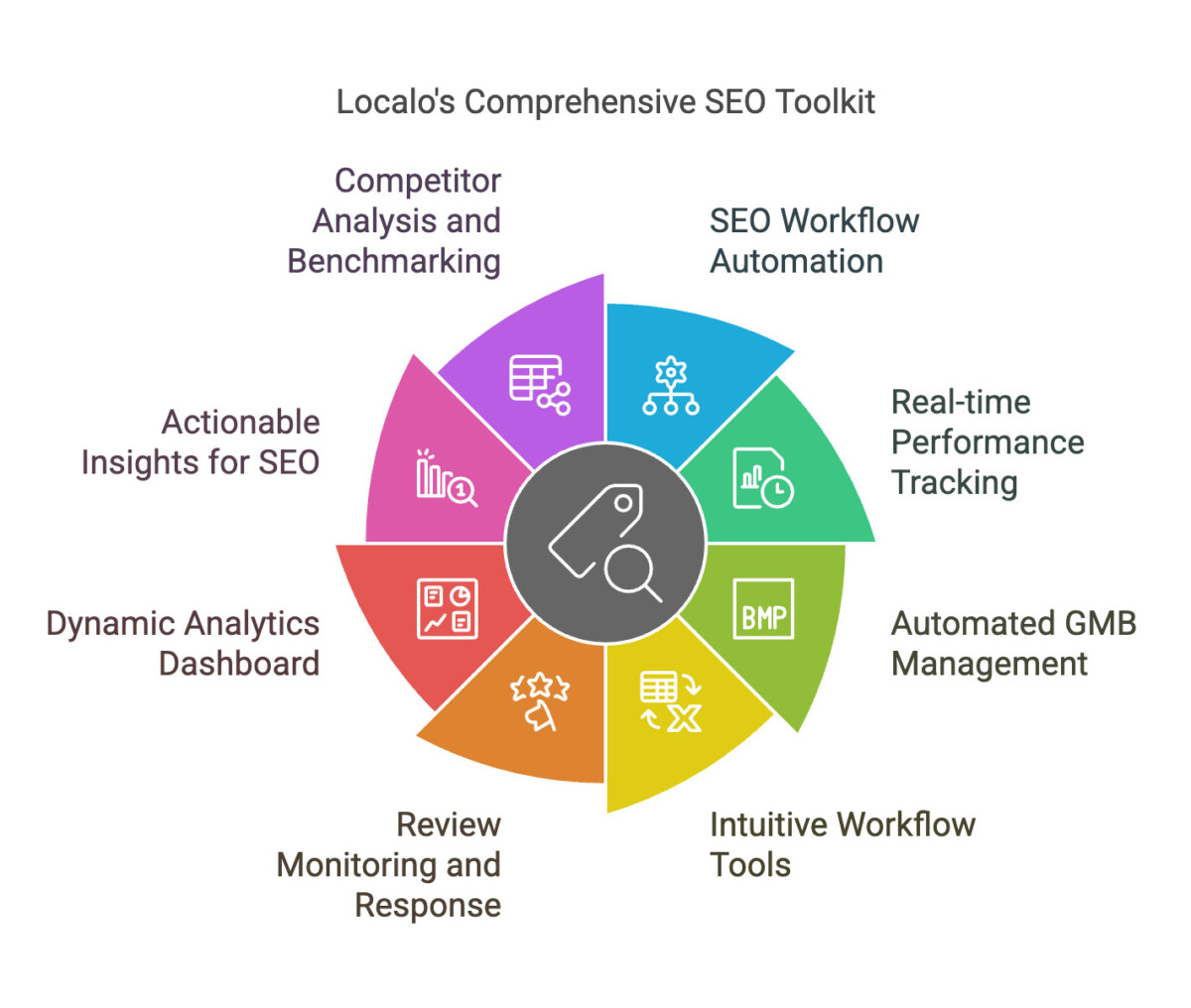 Localo streamlines local SEO efforts by automating tasks like Google My Business Profile management and review monitoring. This helps businesses maintain accurate listings and engage with local customers without spending excessive time on manual updates.