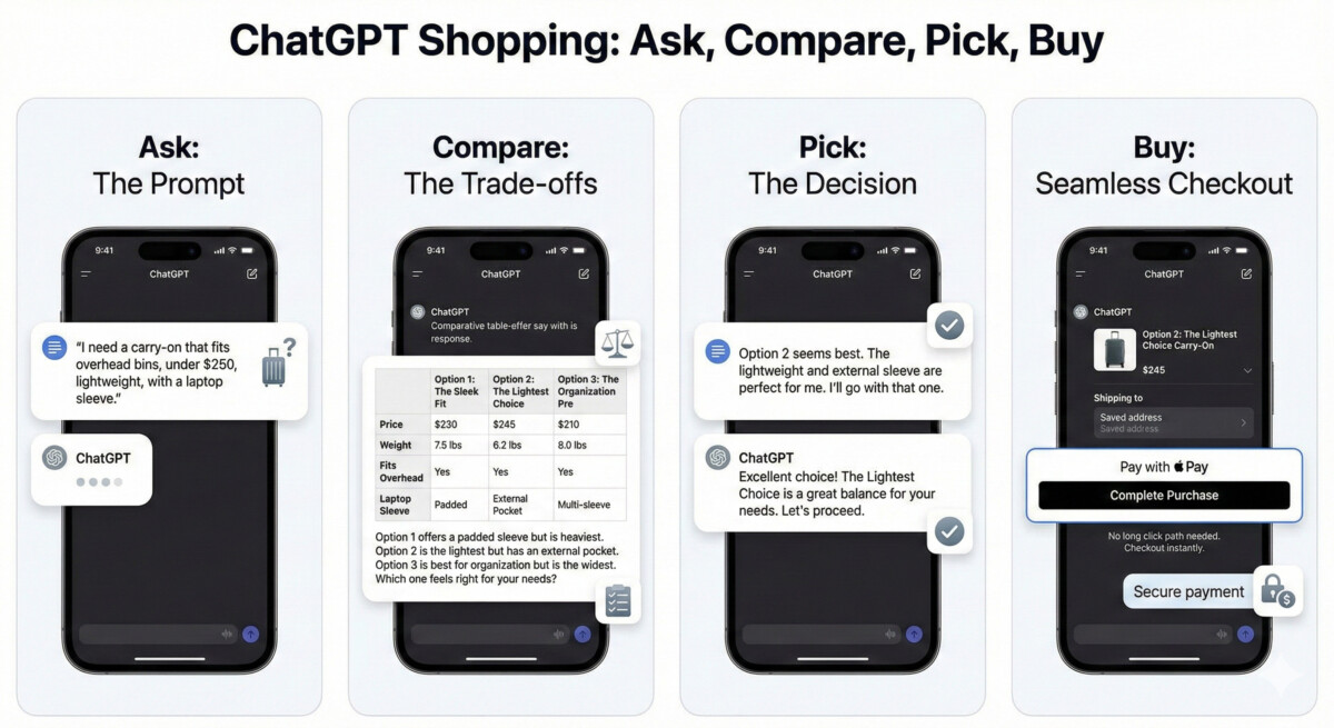 If you want to understand agentic commerce quickly, watch how buyers behave in ChatGPT. The flow is usually ask, compare, pick, buy, and it compresses what used to be five tabs into one conversation.