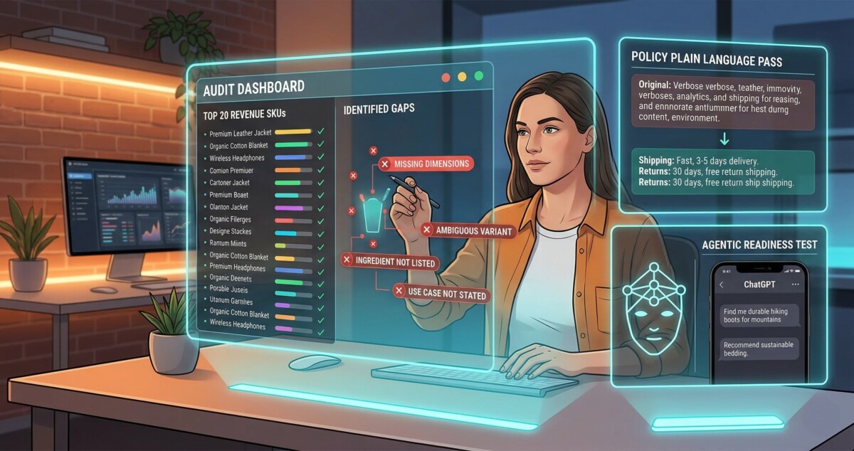 - What You’ll Need: A Shopify store with at least 20 active SKUs, clean product data, and a willingness to audit your catalog and policy content against a new standard.