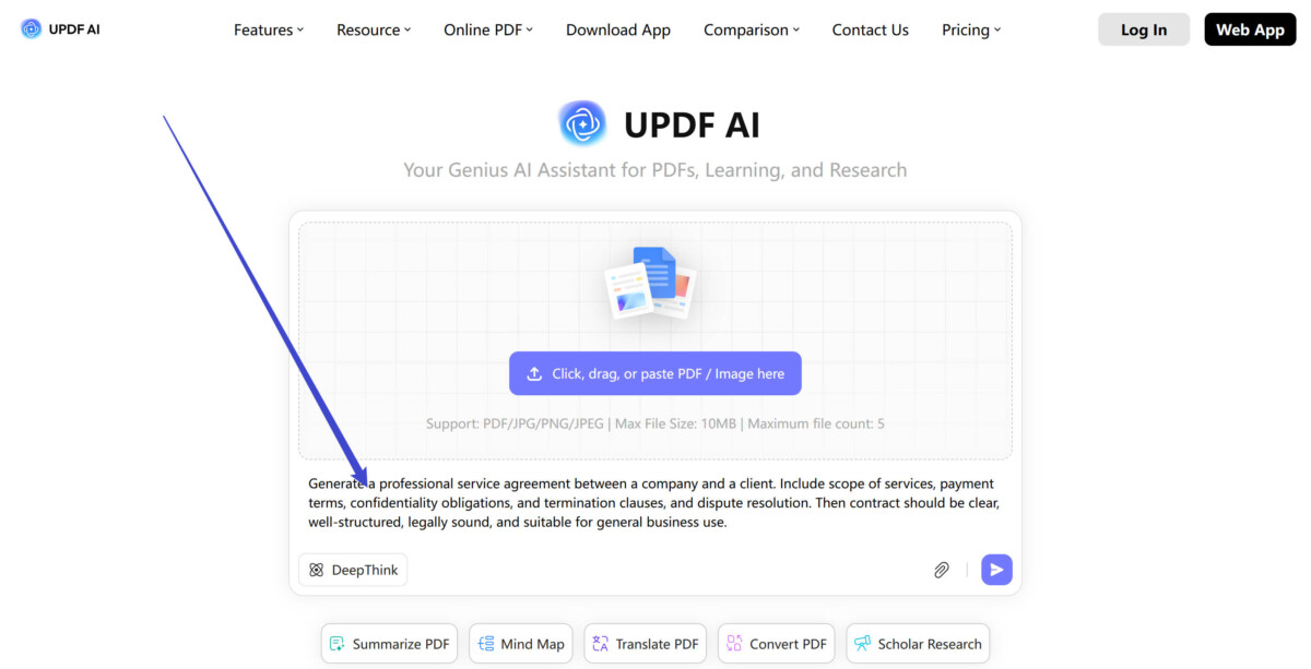 Step 1. Go to UPDF AI Online, enter the contract details in the designated field. Next, enable the “DeepThink” mode and hit the “Send” option.