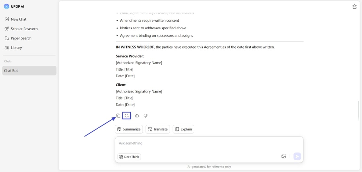 Step 2. UPDF AI will generate a contract followed by your guidance. Hit the “Copy” icon to get a copy of your contract or hit the “Regenerate” icon to regenerate the results if not satisfied. You can also ask in chat for further customizations and amendments in the contract.