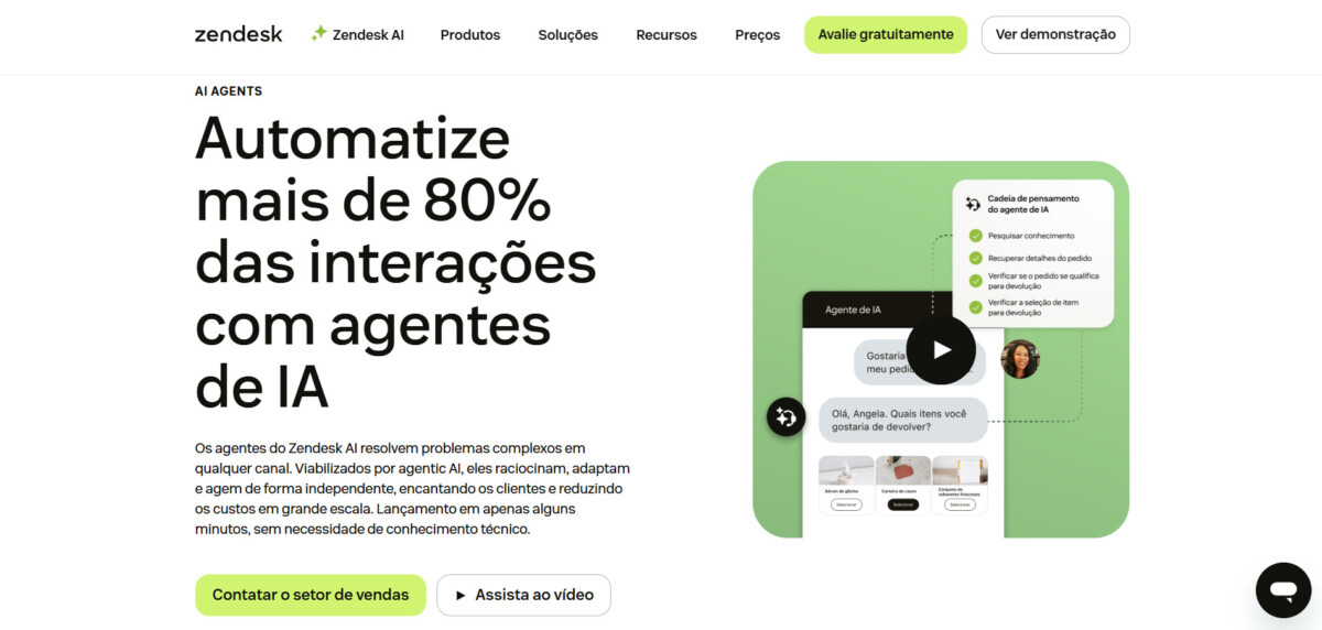 Pricing: Zendesk does not offer a free plan. Artificial intelligence features are available starting at R$ 359 per month, with annual billing, per agent. This package includes benefits such as a customizable AI agent persona, automated resolution reports, a knowledge base with generative search, and an integrated help center.