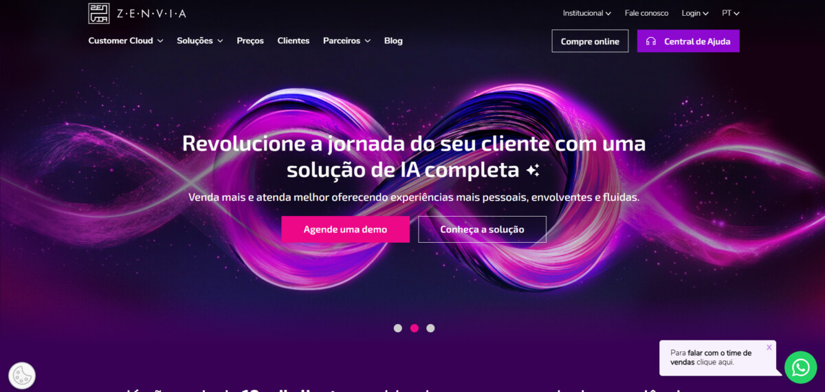 Zenvia offers a platform called Zenvia Customer Cloud that includes generative AI chatbots. The system allows you to create intelligent agents that automate conversations without requiring heavy coding, with integration to multiple channels and a dynamic knowledge base.