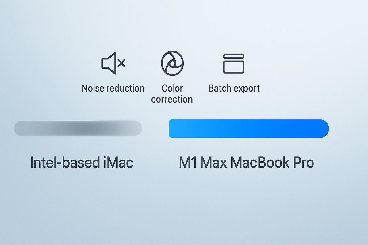Hardware magnifies that edge. In Thom Hogan’s test, an Intel iMac with a Radeon 5700 XT completed AI noise reduction in about 60 seconds per frame—roughly six times slower than an M1 Max laptop that finished in 10 seconds. Work that once filled an evening now fits between email checks.