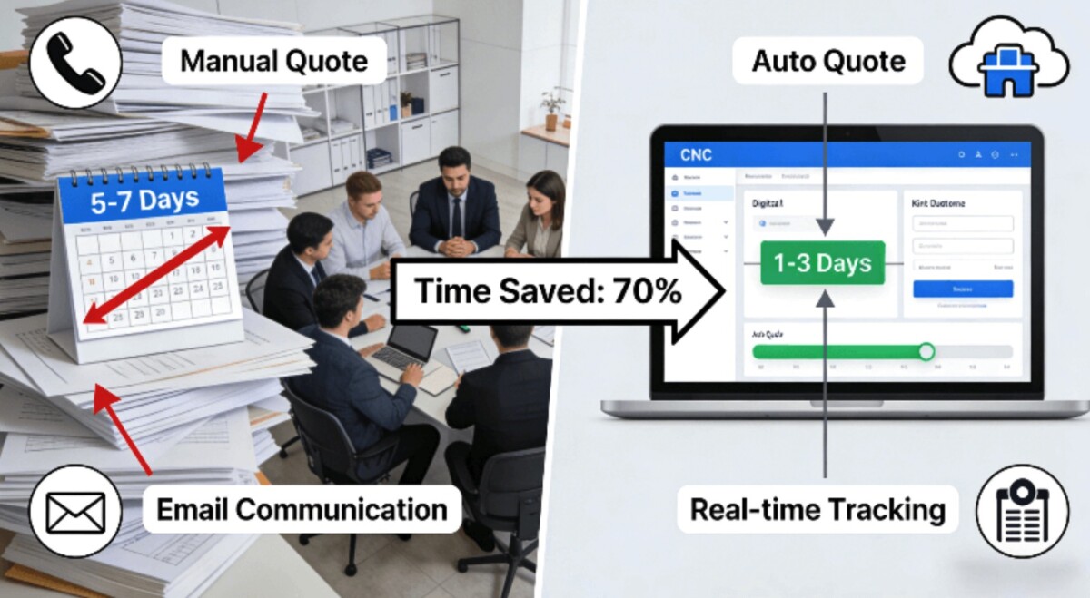 Figure 2: Visual workflow analysis demonstrating 70% reduction in lead time through online CNC turning’s automated quoting and digital tracking compared to manual traditional processes.