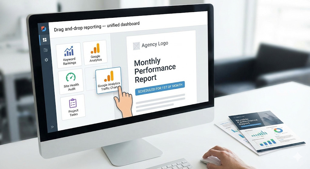 Yes, the article describes drag-and-drop reporting that pulls data from audits, rankings, tasks, and marketing results in one report. You can save a report as a template and reuse it for every client. This makes monthly reporting faster and more consistent, especially when you white-label it with your agency branding.