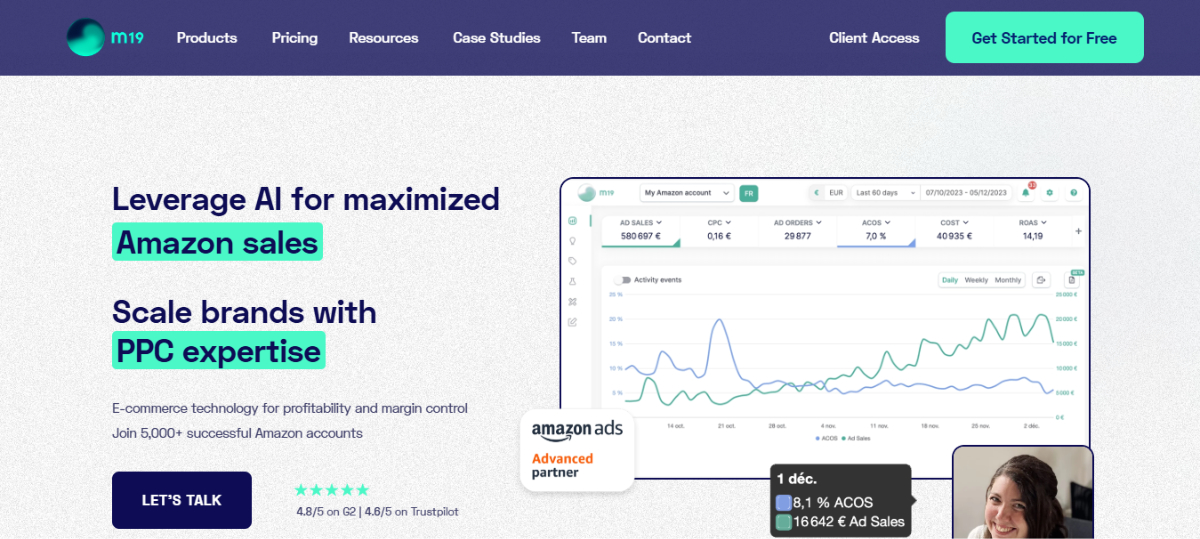 With features like AI-powered bid adjustments, automated keyword discovery, and performance analytics, m19 ensures precision-driven advertising strategies tailored to each seller’s needs. The intuitive dashboard provides real-time insights into campaign performance, helping businesses scale efficiently.