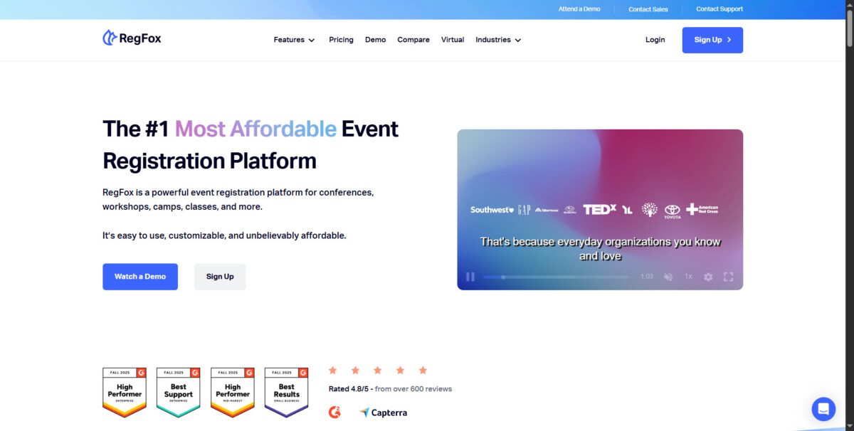 RegFox is event registration software known for its flexibility and affordability. It’s a top pick for nonprofits, educational institutions, and independent organizers who want powerful customization without expensive contracts.