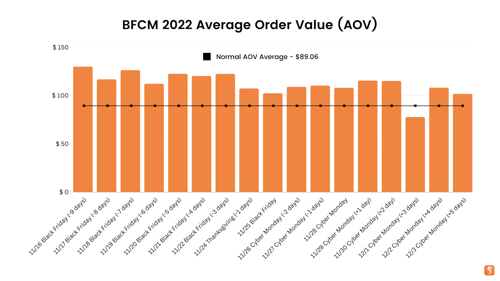 - The average daily AOV during BFCM was $110, compared to the regular daily AOV of $89.06