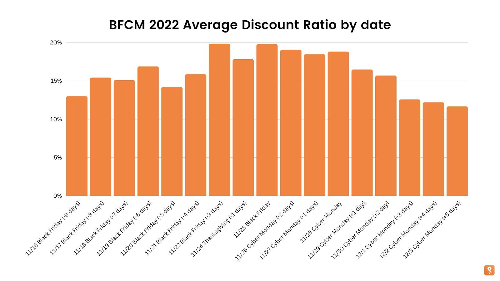 - Stores offered the highest discount (average discount ratio during BFCM was 14%) on Black Friday at 19.78%