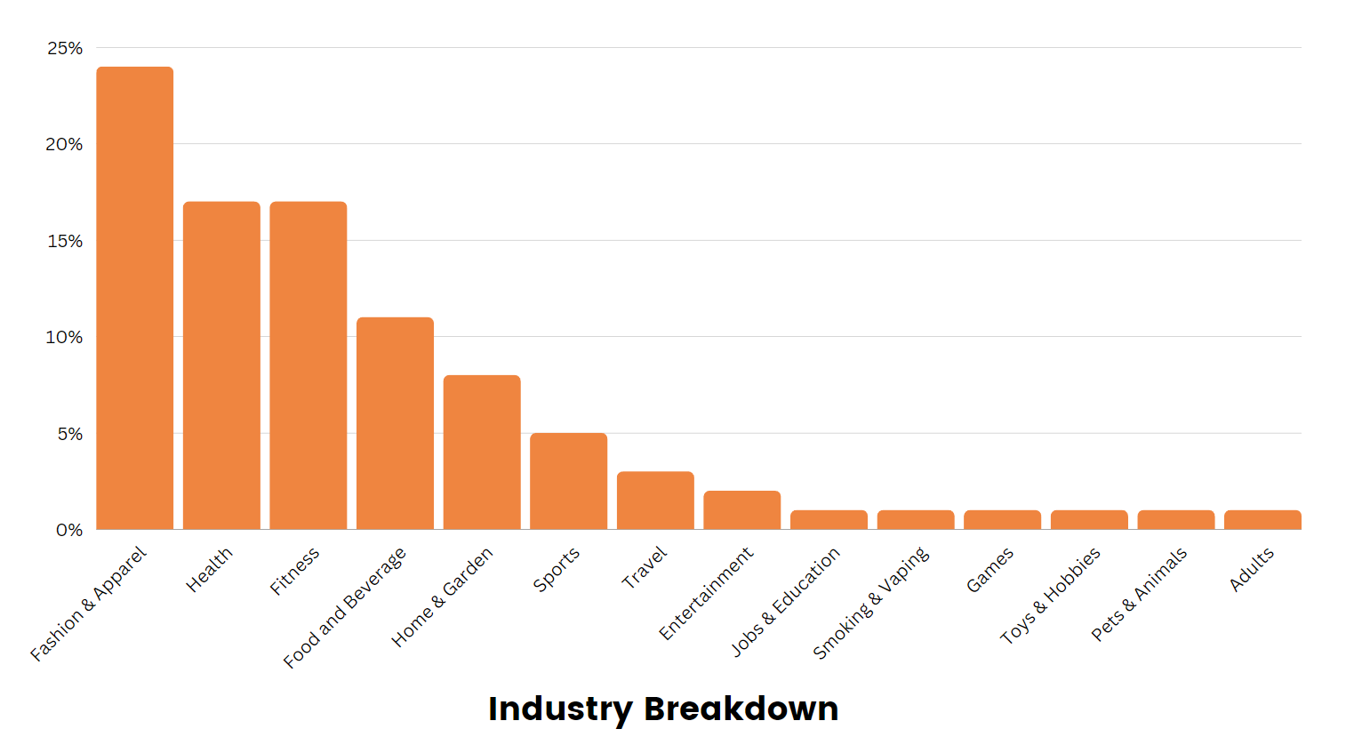 - Other industries include food & drink, sports, adult, arts & entertainment, games, home & garden, jobs & education, pets & animals, smoking & vaping, toys & hobbies, and travel