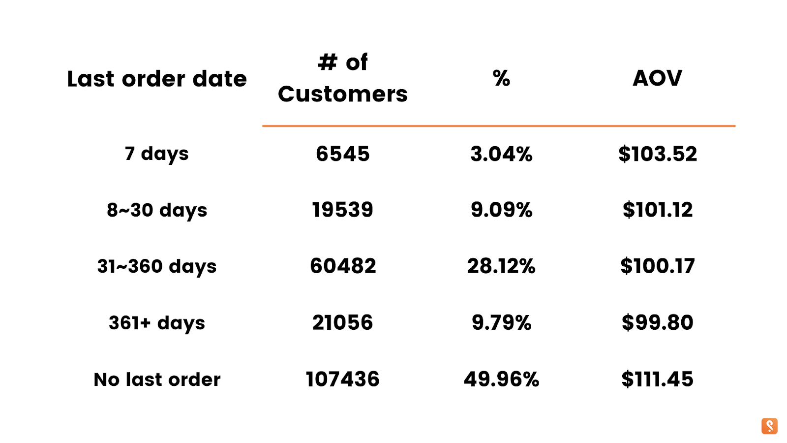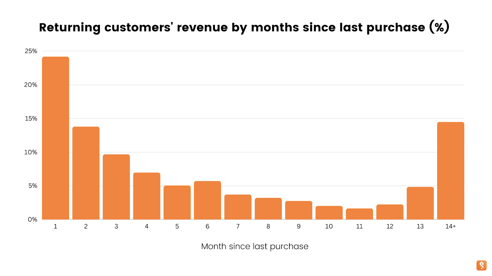 - Almost 40% of returning customers’ revenue came from those whose last purchases were within 2 months.