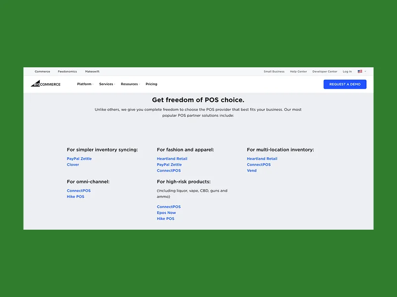 BigCommerce doesn’t have a native POS system. Instead, its POS functionality relies on third-party integrations, partnering with solutions like Hike, Clover, and ConnectPOS.