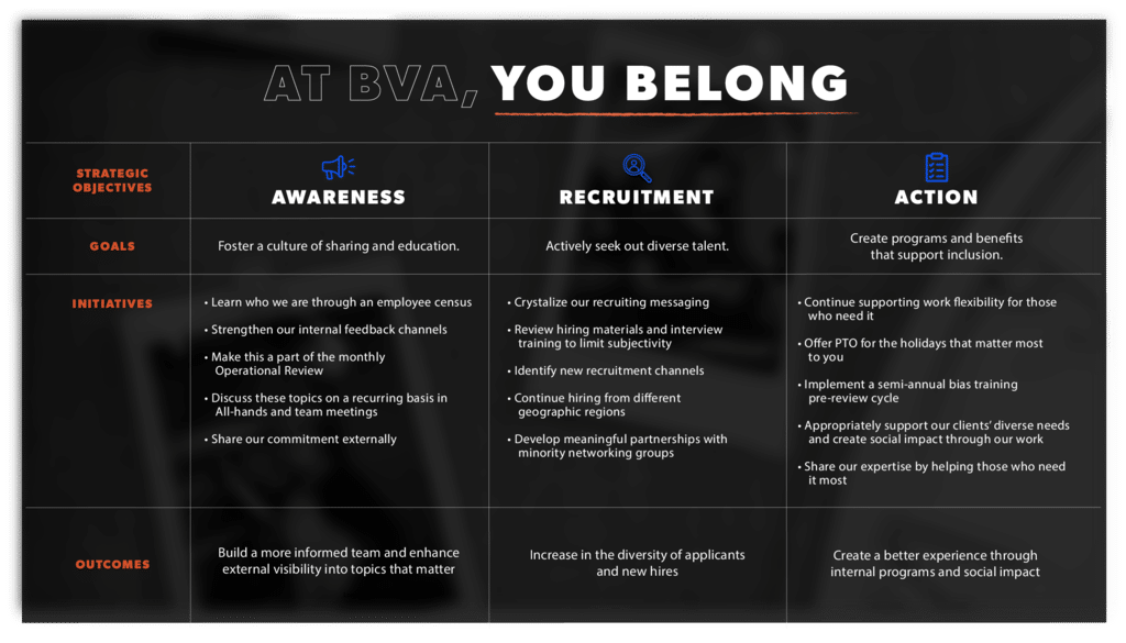 When brainstorming around our overall vision for the BVA Diversity & Inclusion plan, our team went through a lot of drafts. These initial vision statements were helpful, but ultimately too detailed and lengthy to be impactful. We wanted a vision statement that not only aligned with our mission, but cut right to the core of what we want to stand for. This is what we came up with: