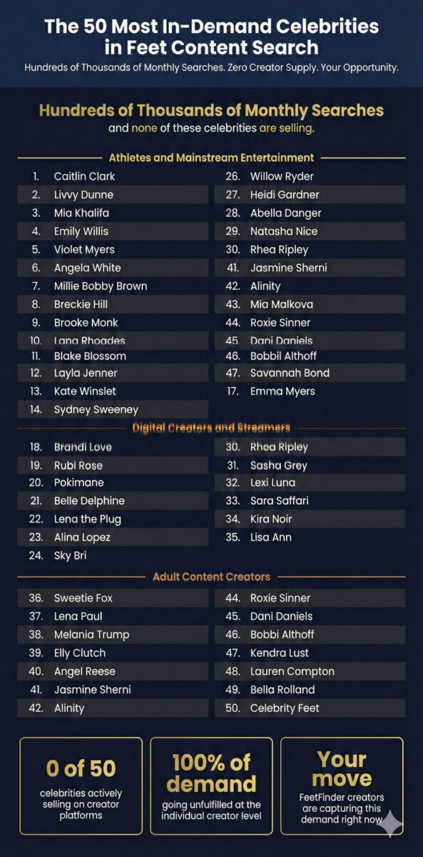 Right now, tens of thousands of people every month are searching for feet content connected to specific celebrity names. Collectively, these searches add up to hundreds of thousands of monthly queries – a staggering volume of demand concentrated in one of the fastest-growing niches in the independent creator economy.Here’s the part that should get your attention as an aspiring or active content creator: not one of those celebrities is selling that content.That gap – between massive, measurable buyer demand and zero celebrity supply – is one of the most significant opportunities in the feet content market today. And understanding why it exists, and what it tells you about buyer psychology, could fundamentally change how you position yourself as a creator on platforms like FeetFinder.This article breaks down what the data actually means, what celebrities have that drives this demand, and – most importantly – why you as an independent creator have advantages that no celebrity can match.