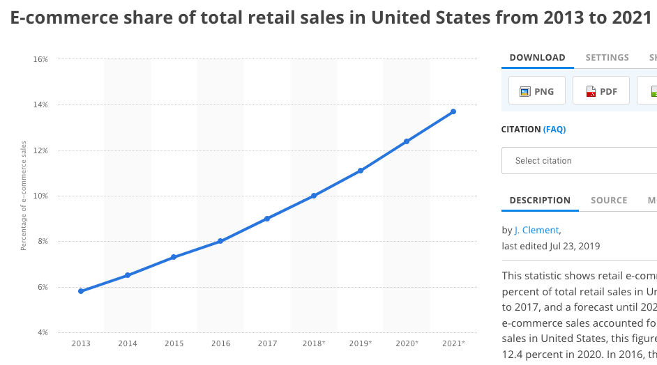 Ecommerce currently accounts for 11.1% of total U.S. retail sales. By 2021, it’s expected to grow to nearly 14% of overall sales: