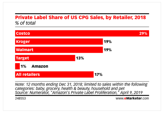 To better understand this threat, look no farther than Costco’s Kirkland Signature brand, which generated nearly $40B in sales in 2018, more than CPG heavyweights Campbell Soup, Kellogg, and Hershey combined. Kirkland brands are often 20% cheaper than national brands, forcing CPG companies to cede market share or lower prices to compete.