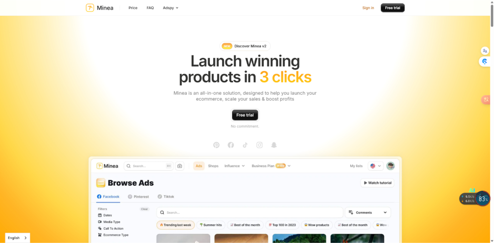 Minea is a competitive intelligence tool that helps marketers discover trending products and analyze ad performance. While it supports TikTok, its primary focus is on e-commerce platforms, making it a popular choice among dropshippers. It also offers a TikTok ad library, though its features are not as advanced compared to other platforms like Pipiads.