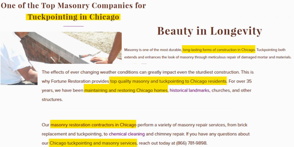 By strategically placing “Chicago” in their page’s body, service descriptions, and headings, it signals to search engines and readers alike that this business is the go-to choice for masonry work in the area.