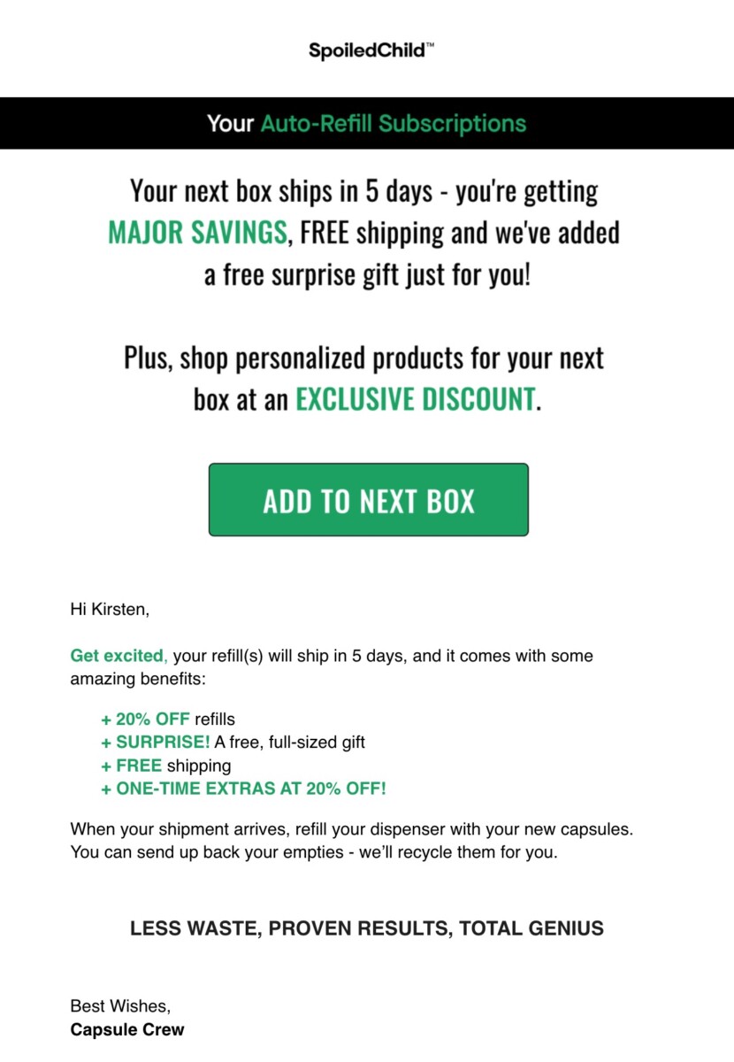 My wife recently received a routine auto-refill notification from SpoiledChild—a simple “your box ships in 5 days” email. Except it wasn’t routine at all. Buried inside what most brands treat as a boring compliance alert were four distinct revenue plays happening simultaneously.