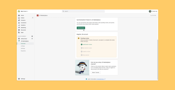 Note: On YouTube, you’ll find several step-by-step tutorials for how to set up and succeed with Shopify’s JD Marketplace channel. We’ll cover the bases here, but be sure to check out those tutorials for more in-depth guidance.