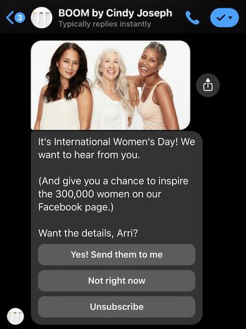 Boom By Cindy Joseph invests a lot in content and is leveraging Messenger to distribute it. The content they send out is so good and so relevant that although they rarely push out promotions, these subscribers go out of their way to purchase.