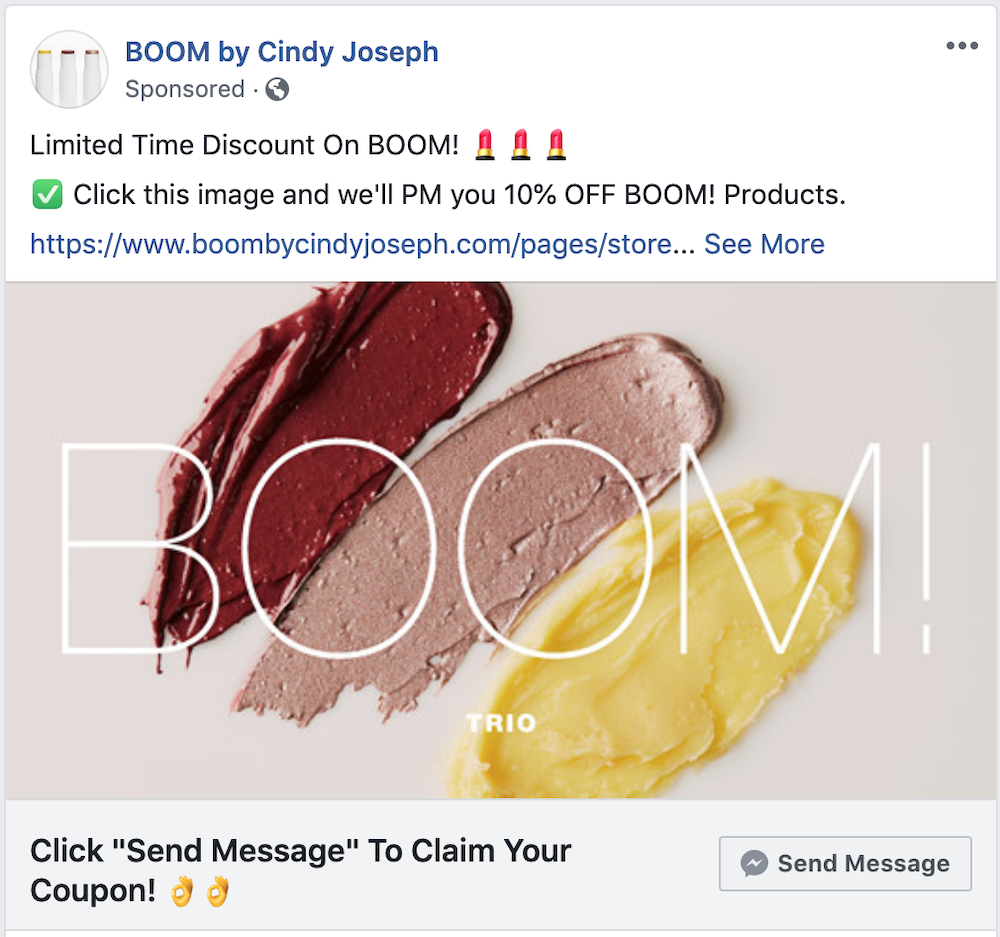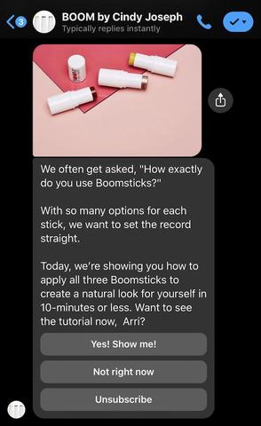 Boom By Cindy Joseph is leveraging Click to Messenger ads to deliver coupons to potential customers. Once a customer clicks the ad, they’ll receive this message and will also be subscribed to Boom’s Messenger list.