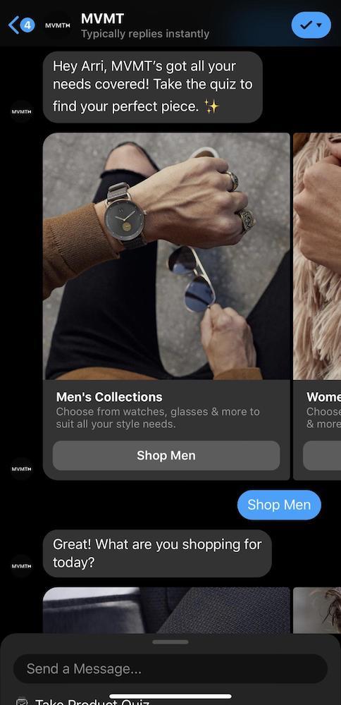 With quizzes, you can engage potential buyers and collect data to personalize product recommendations. MVMT Watches created a product quiz for potential customers who want to interact with MVMT through their Facebook page or Messenger.