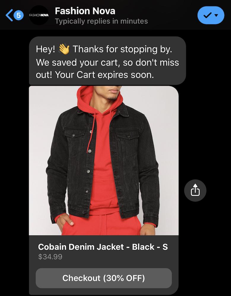 First, you get a user to opt-in through a pop-up or an add to cart checkbox. Once the user reaches checkout without completing the purchase, they’ll receive a series of follow up messages from your brand.