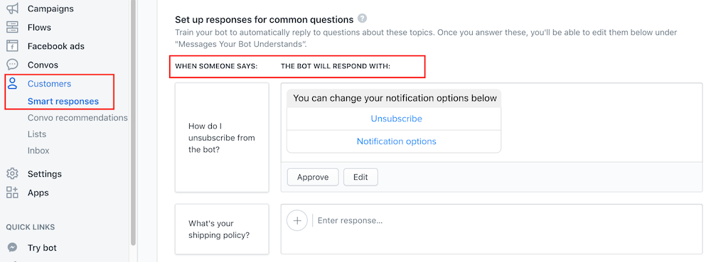 Support: While you’re running Messenger marketing campaigns and ads, customers will ask questions in your Messenger inbox. It’s crucial to leverage AI to respond to some of those questions instantly.