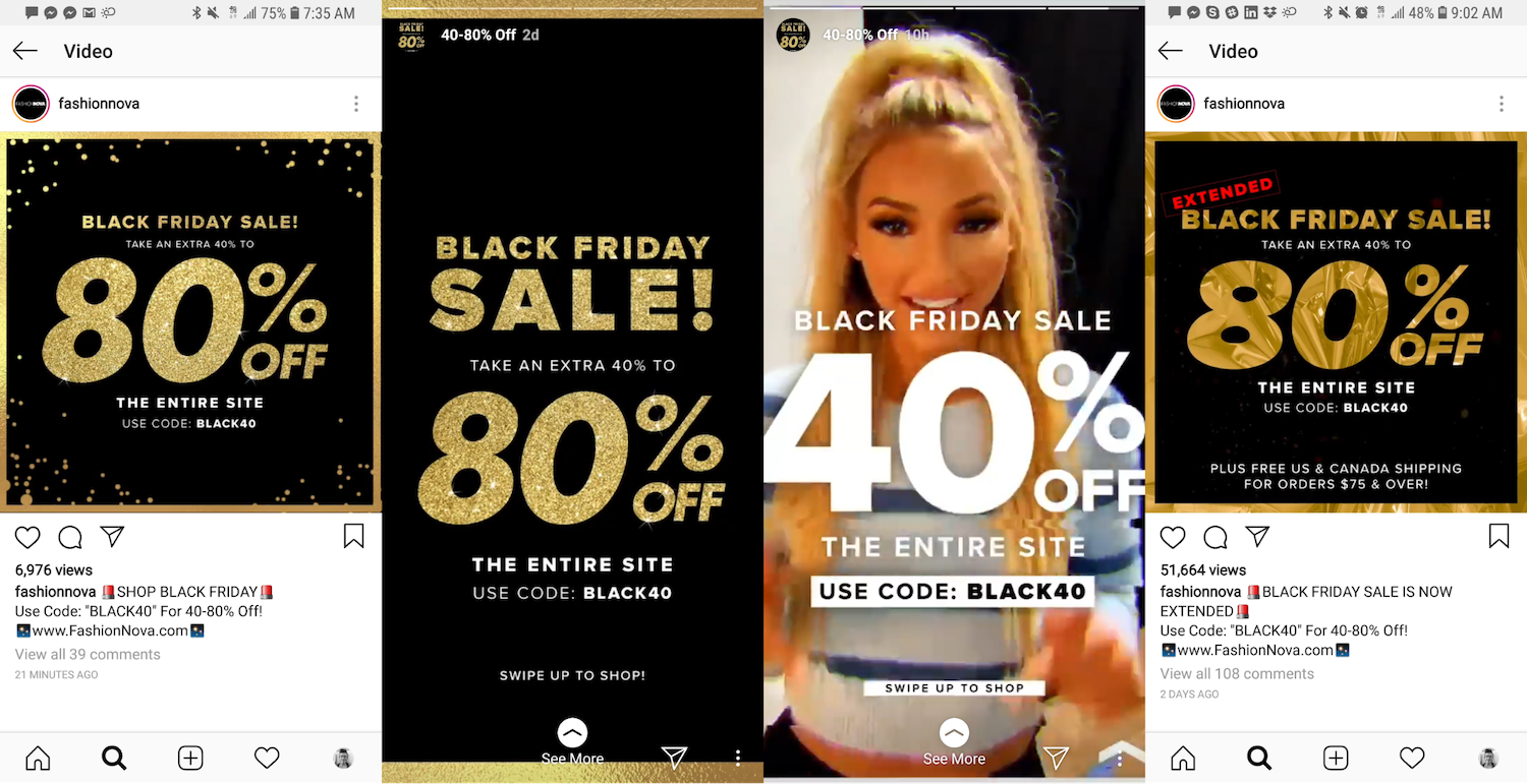 Fashion Nova also took the same Blockbuster approach on Cyber Monday by blasting social media ads that displayed an “up to 90% off sitewide” discount code: