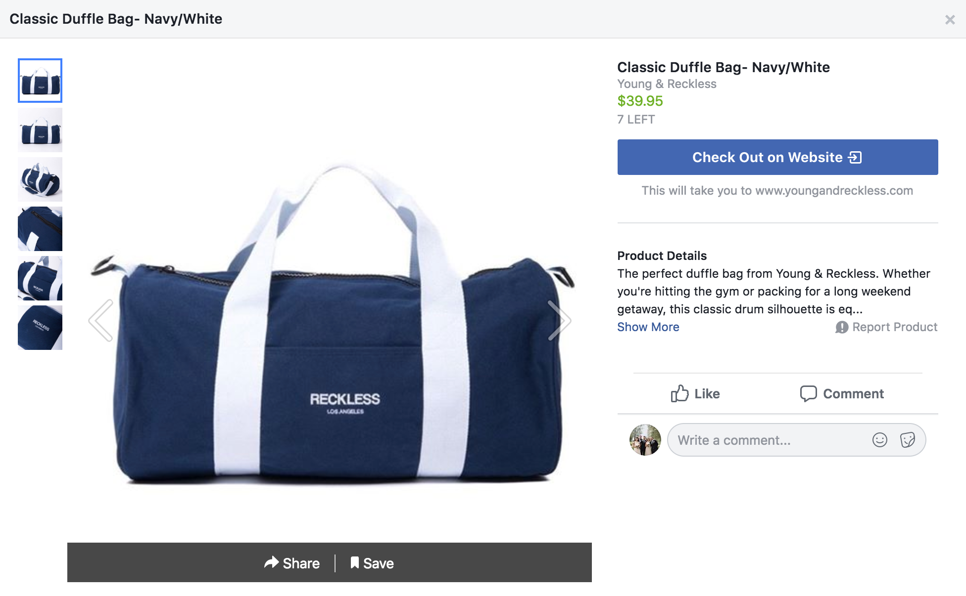 Young & Reckless has also expanded its ecommerce sales channels by offering customers native shopping opportunities on Facebook: