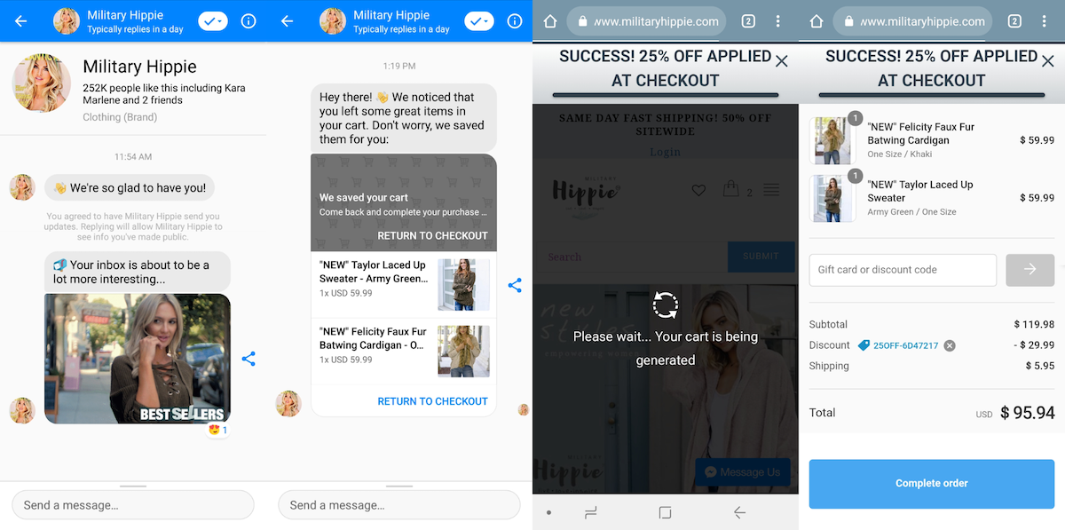 Military Hippie’s ecommerce team also uses Recart to recover abandoned shopping carts via Facebook Messenger and turn them into repeat buyers. According to Recart, over half of customers already prefer to be contacted via Messenger which can generate four times more in revenue than using email for the same purpose.