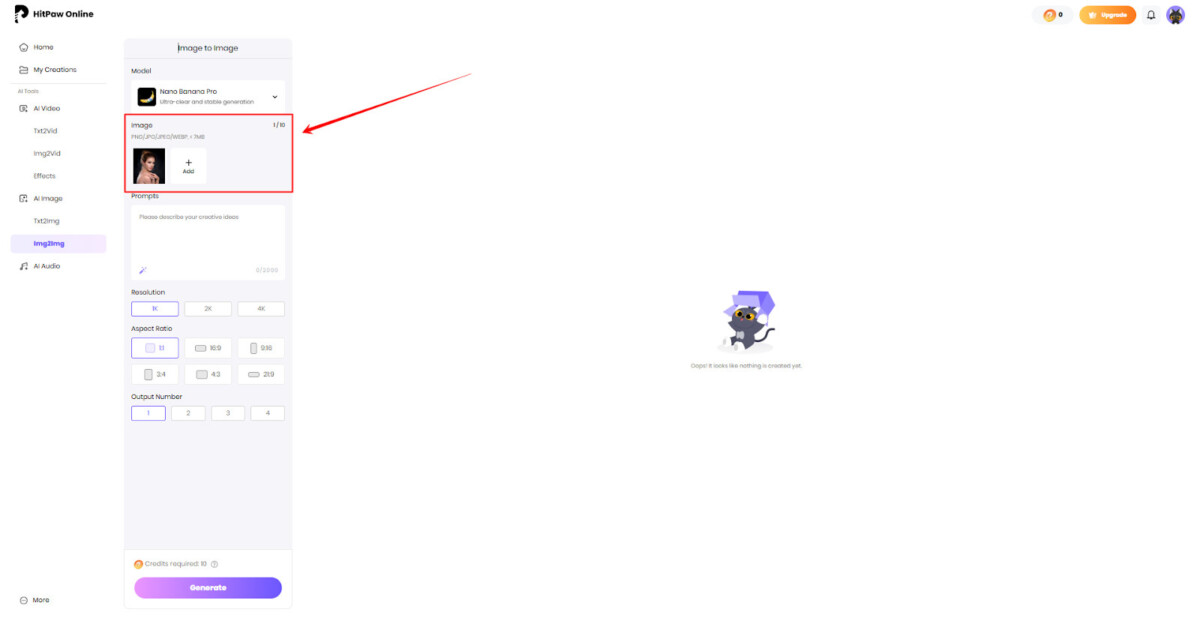 Step 4: After setting everything, such as resolution, aspect ratio, and output numbers, click the generate button and wait a few seconds. The AI will process your input and create a new version of the image.