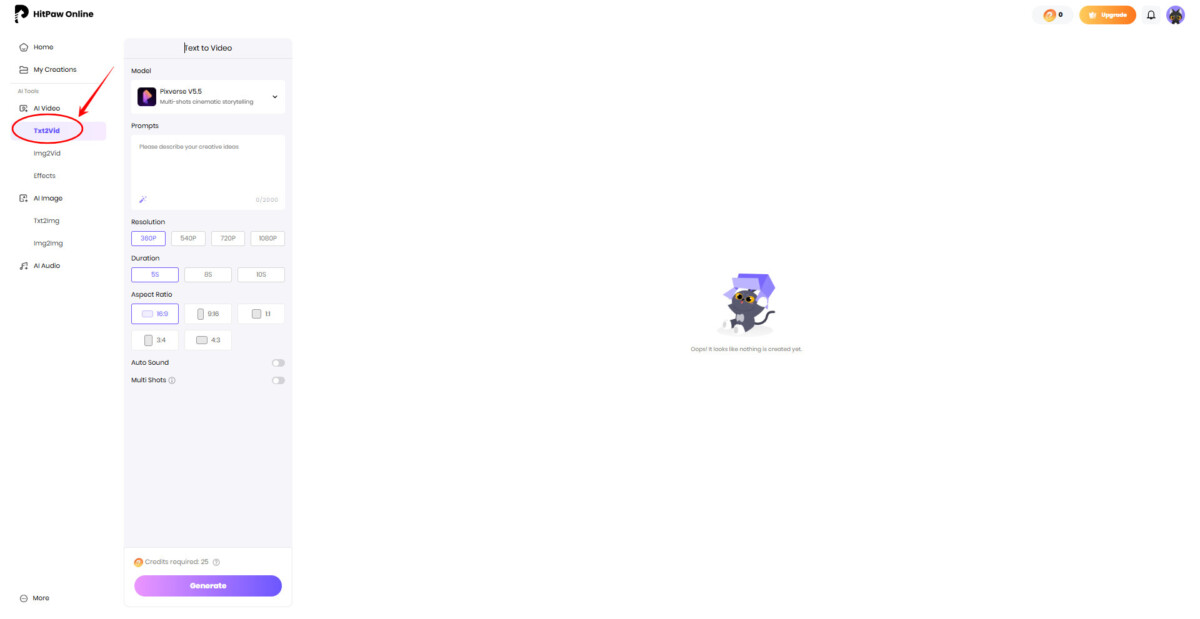 Step 1: Go to the AI video generator online in your browser. You don’t need to login ot download anything. Here, click on “Txt2Vid” from the side panel.