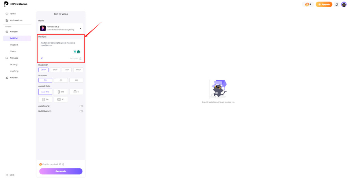 Step 2: Now, in the prompts box, describe the video you want to create. Make sure to keep the prompt short and trend-focused.