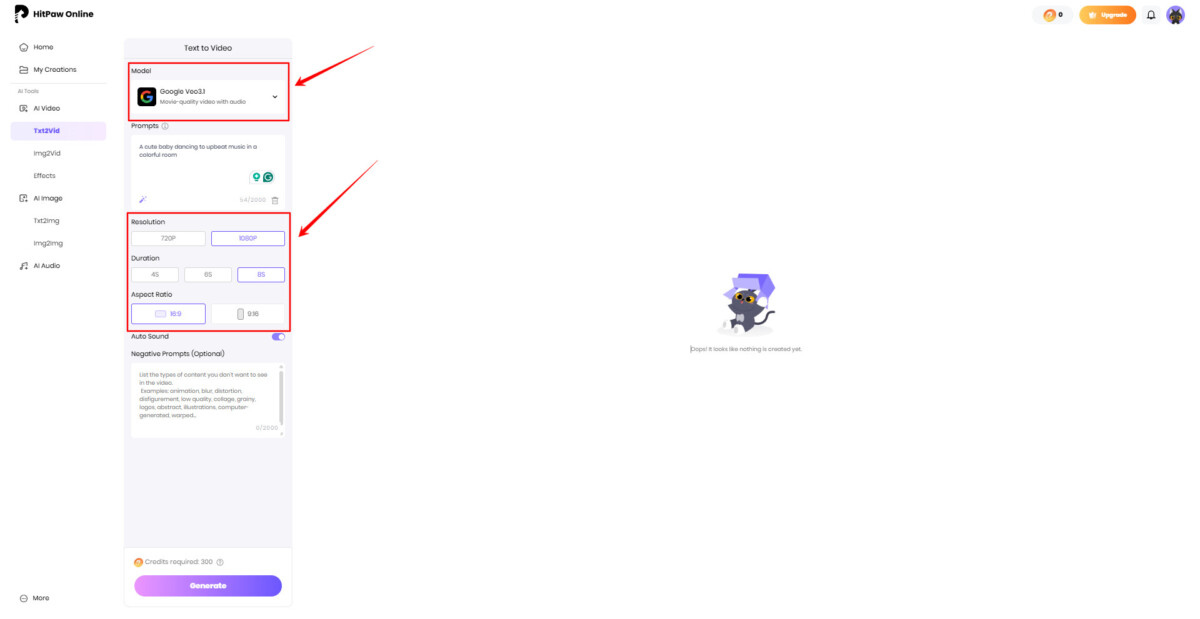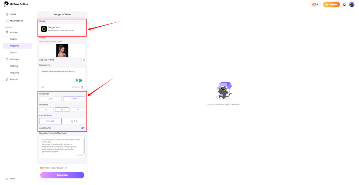 Also, choose the AI model you want to use. Use the Google Veo3 for general video creation, while Kling 2.1 if you want to make the motion feel smoother. Hailuo is also great for precise video generation.