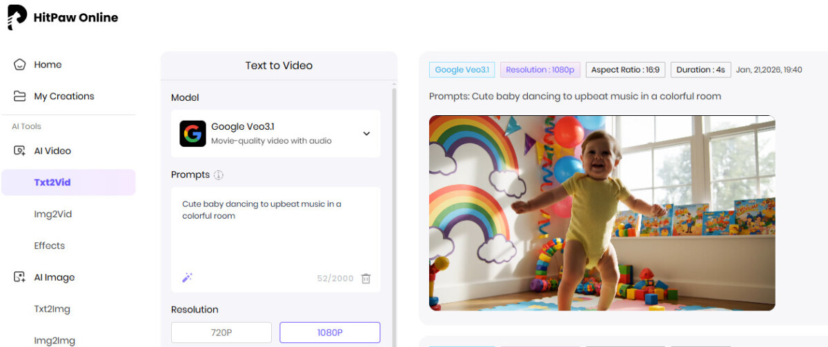 For instance: “Cute baby dancing to upbeat music in a colorful room” or “Motivational quote video with calm background and smooth motion.”