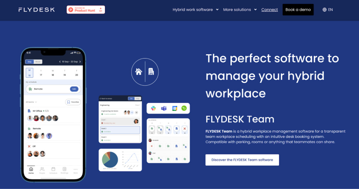 Flydesk is a hybrid workplace management software designed to streamline team scheduling with an intuitive desk booking system. It also integrates scheduling for parking spaces, rooms, and other shared resources within the workplace.