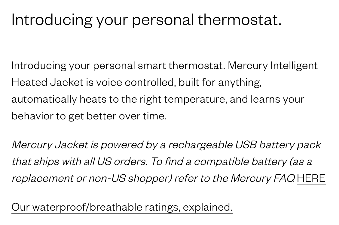 The comparison of a jacket to a ‘personal smart thermostat’ helps shoppers imagine using their new jacket to heat themselves up in any temperature.