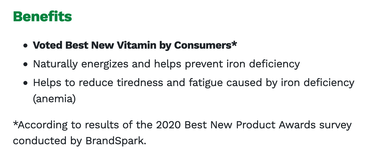 Jamieson lists awards in their product description for Iron + Vitamin B12 Chewable vitamins.