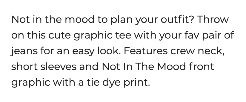 Instead, imagine yourself having a guided conversation with your customer. This dialogue should be informative and provide guidance to your shoppers, as if they were talking to a real salesperson. Shoppers crave dialogue, and your product descriptions are an opportunity to start brand-rich conversations. In this sense, the shopping experience should be a catalyst for selling your products successfully.
