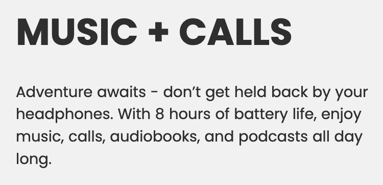 Aftershokz doesn’t just write the features or specs of their products. They explain how these features will improve their customers’ lives. With patented bone conduction technology, shoppers’ comfort and total awareness is increased. With an 8 hour battery life, their headphones allow a person to enjoy listening to music, calls and podcasts all day long.