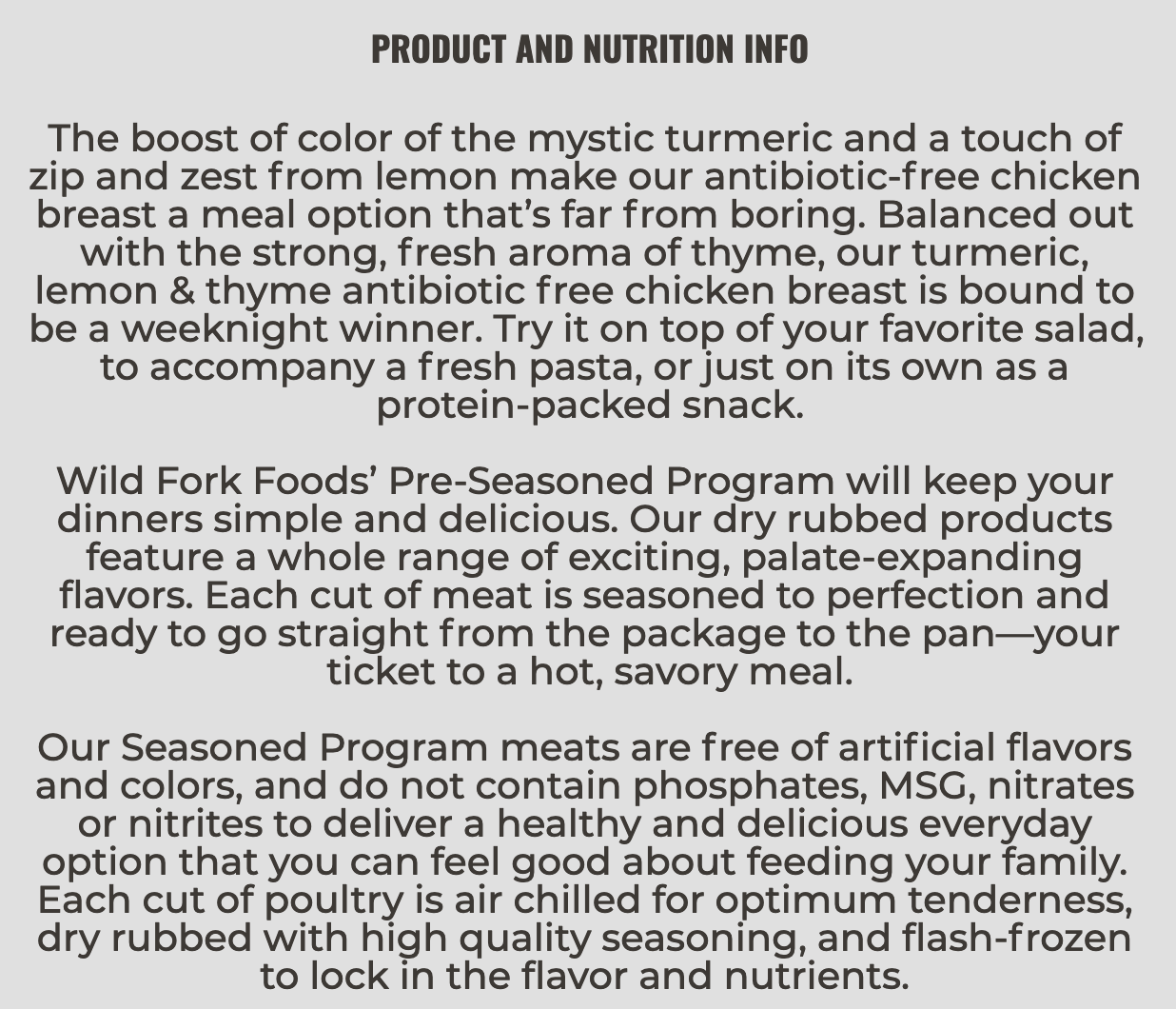 In this example, Wild Fork Foods uses sensory words such as ‘fresh aroma’, ‘zip and zest’ and ‘hot, savory’ to describe their products’ flavor and nutrients.