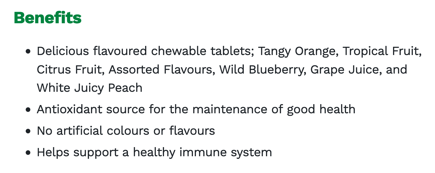 Here’s an example of a scannable product description for Vitamin C Chewables from Jamieson Vitamins.